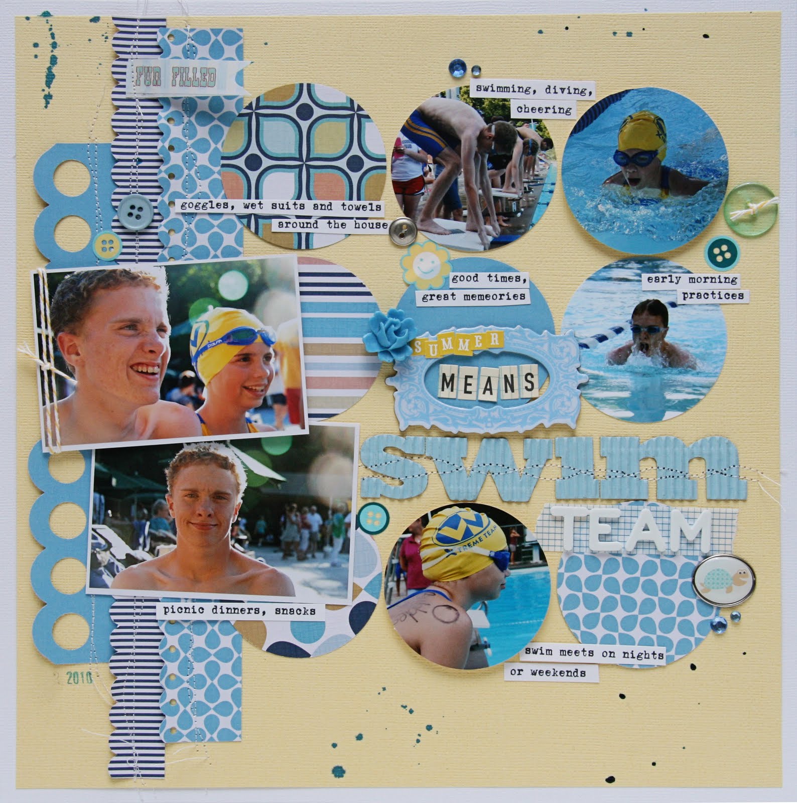 Lastly, I added some wavy stitching to the title and the border to simulate the ripples in the pool.